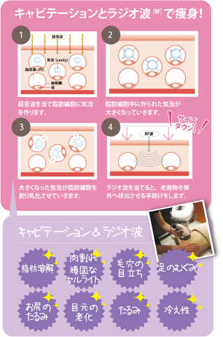 「キャビテーション」( 特殊な超音波 ) で、脂肪を乳化状態にして体外に排出。